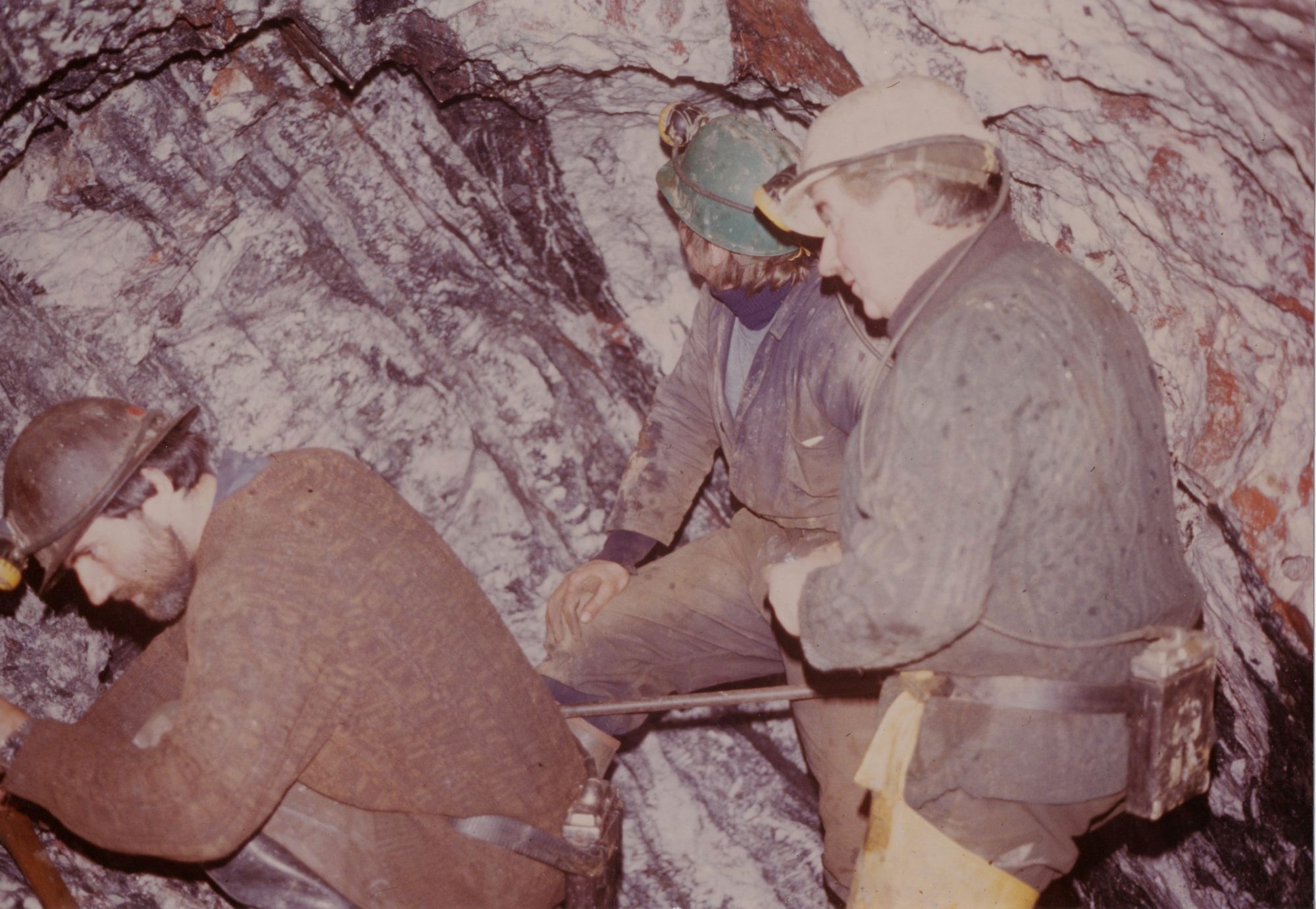 Dick arrived the next day - beanie hat pulled over his eyes. He was quieter than usual - he just pointed to the landrover and said 'lets go - head for Scotland'. Conversation was short on the way - he wanted to visit some strange places I'd never heard of - we went everywhere - places I knew, places I thought were worked out and closed years ago - he just opened a hole and shoved his nose in, and out came specimens. Scotland, the North, Caldbecks, Weardale - that last trip was a whirl. We ended up at Gwynfynnyd gold mine in north Wales too - some of the guys who were working it - John Daniels and his crew, were friends of Dicks from Cornish mining. I took some good photos of them working there - and a couple of Dick in the stopes - about the only ones we ever got of him underground.