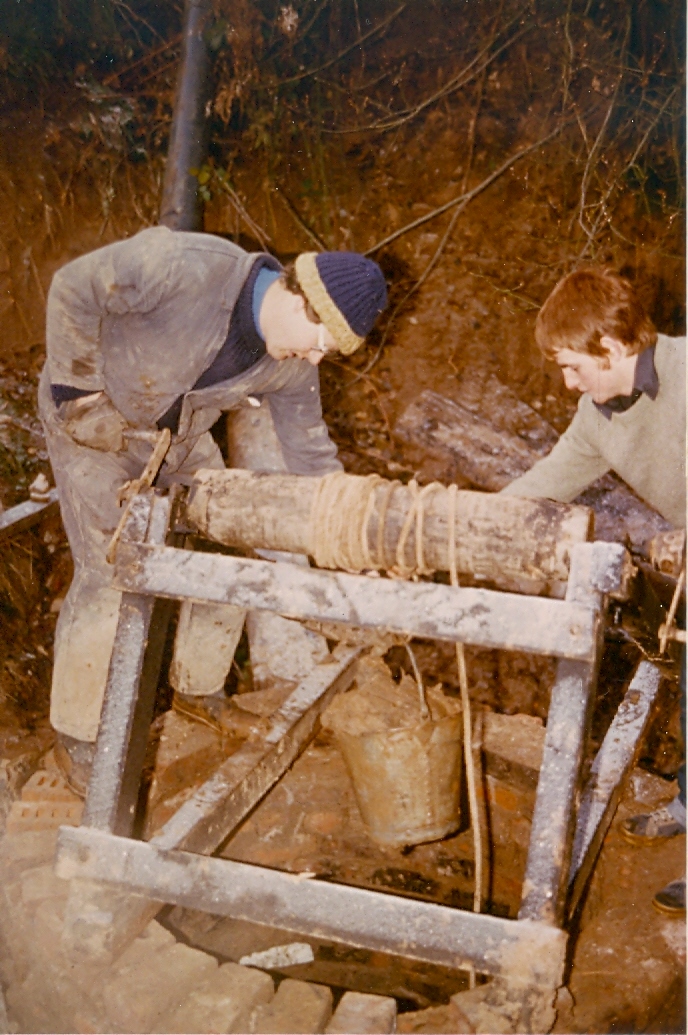 We found all sorts of stuff at Alderley. The photo shows Steve Mills on the windlass at Stump Shaft - a dig near Wood mine that led into the Hough level. We built a brick shaft and dug out the bottom. Engine Vein was a great spot - I had a JCB there on the farm. Richard, the National Trust Warden asked me to do some work on the footpaths on the Edge. I just looked at him for a while - he grinned, and said - if you happen to stray off the path onto a mine - well, you weren't to know! So I ended up digging all sorts of nice things off the top of Engine Vein and Stormy Point with a JCB. We had a lot of fun there - found some superb wulfenite crystals which I still have, together with native mercury - and over the hill, the West Mine - was a constant source of amusement - Paul Sorensen, the owner, was fantastic. I went down one day and came back clutching the best Tyrolite specimen found in the British Isles. Presently languishing in the Natural History Museum along with the rest of the stuff I found at Alderley, while they find time to work on it. Whatever happened to Dick Barstow!! Help Dick...!