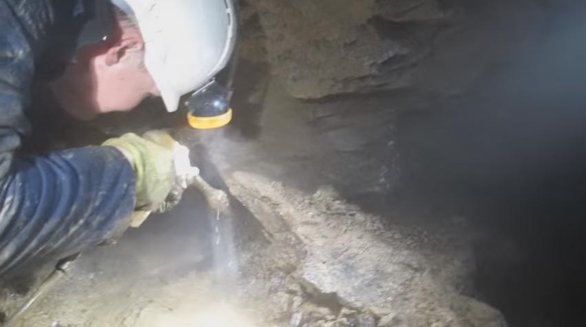 Adam Pacey - researcher at the Natural History Museum takes control of the pressure washer to help open up a cavity containing huge clusters of purple fluorite crystals....